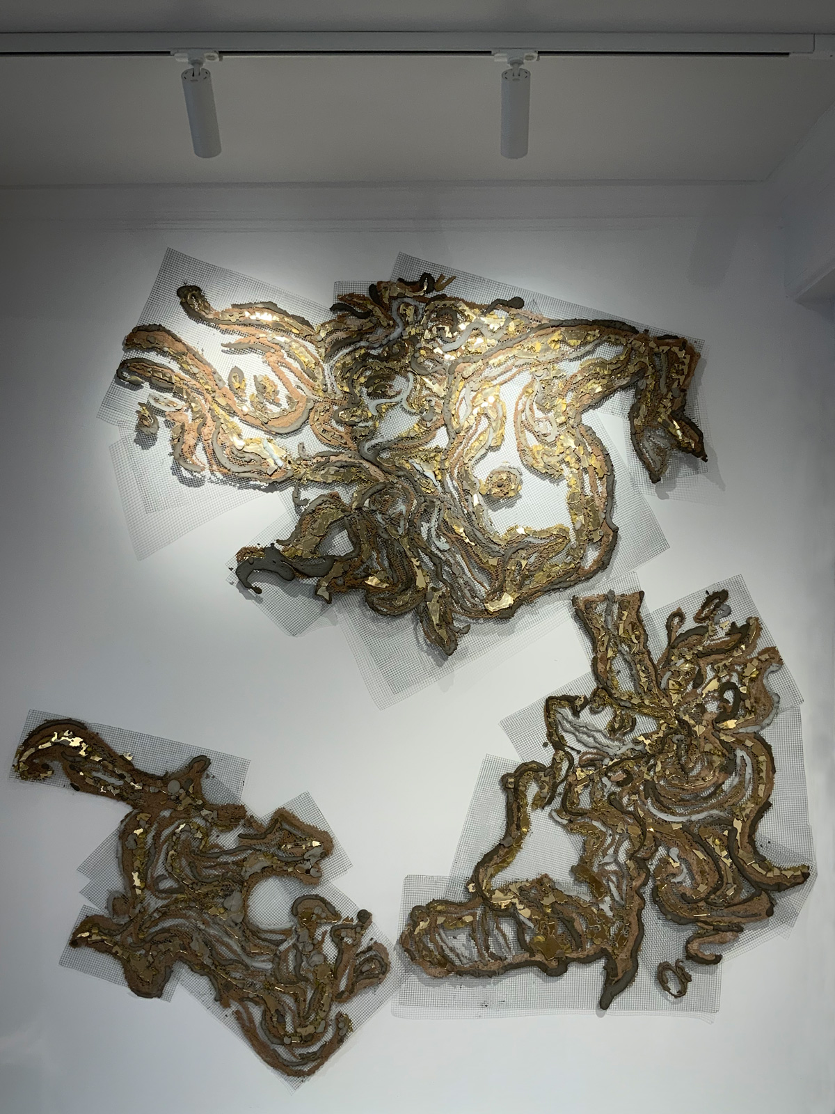 Concrete, laser-cut gold mirror and metal mesh